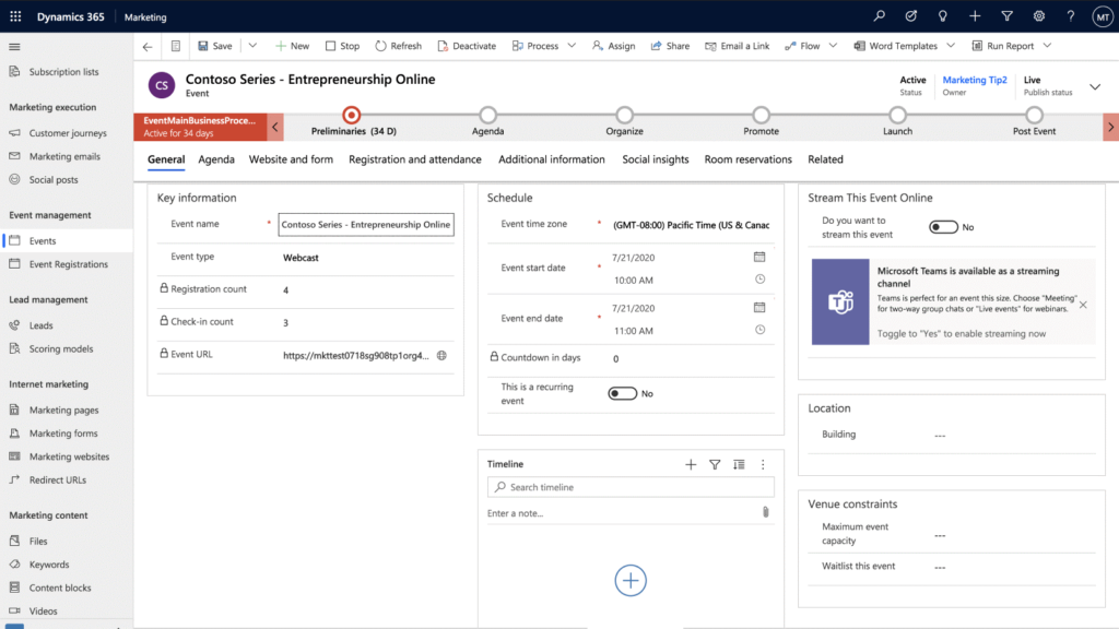 The Dynamics 365 Marketing event management feature is very comprehensive and helps to simplify event planning, and budgeting, through promotion and publication, attendee registration, final analytics, lead generation, and evaluation of ROI.