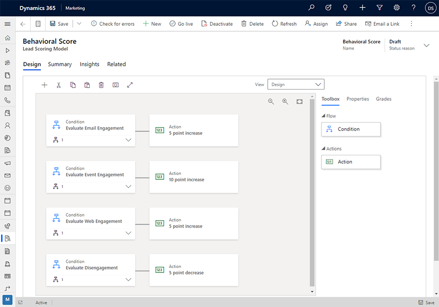 Dynamics 365 Marketing helps to build flexible lead scoring models based on demographics, regency, frequency, and monetary value (RFM) rule based on automatically collected customer interaction data, across email clicks, websites visited, event registrations, and more.